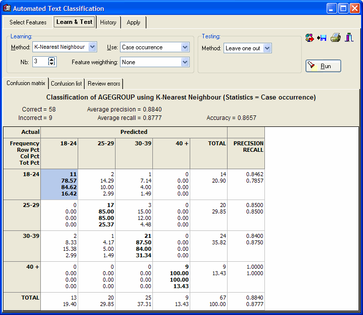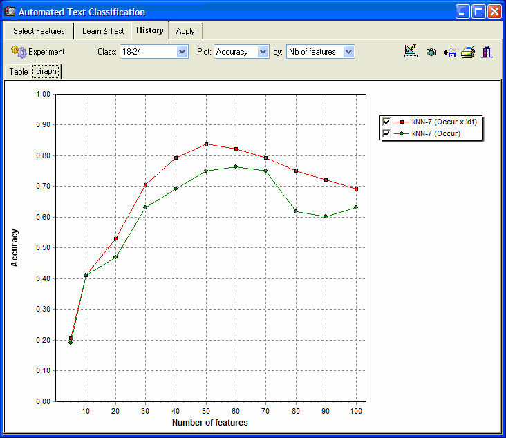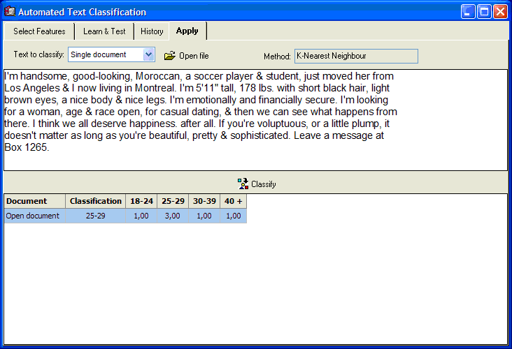 - Naive Bayes and k-nearest neighbors classification methods applied on occurrences, frequencies, percentage of words, etc.