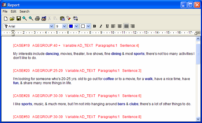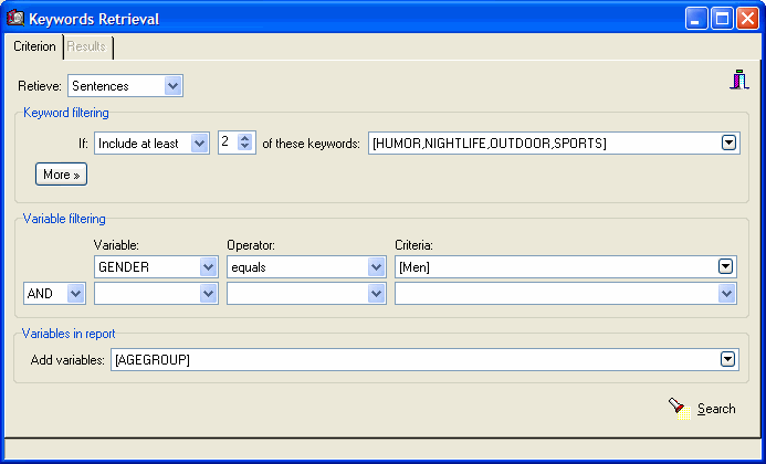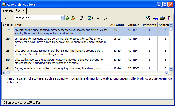 An entirely new keyword retrieval dialog allows one to extract documents, paragraphs or sentences with user defined combination of keywords. Retrieved text segments may optionally be tagged using QDA Miner codes (click on the thumbnails below to see screen shots).