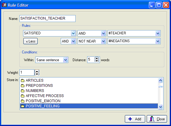 - Disambiguation rules with Boolean (AND, OR, NOT) and proximity operators (NEAR, AFTER, BEFORE) may now be added to categorization dictionaries (click on thumbnail to see a screen shot).
